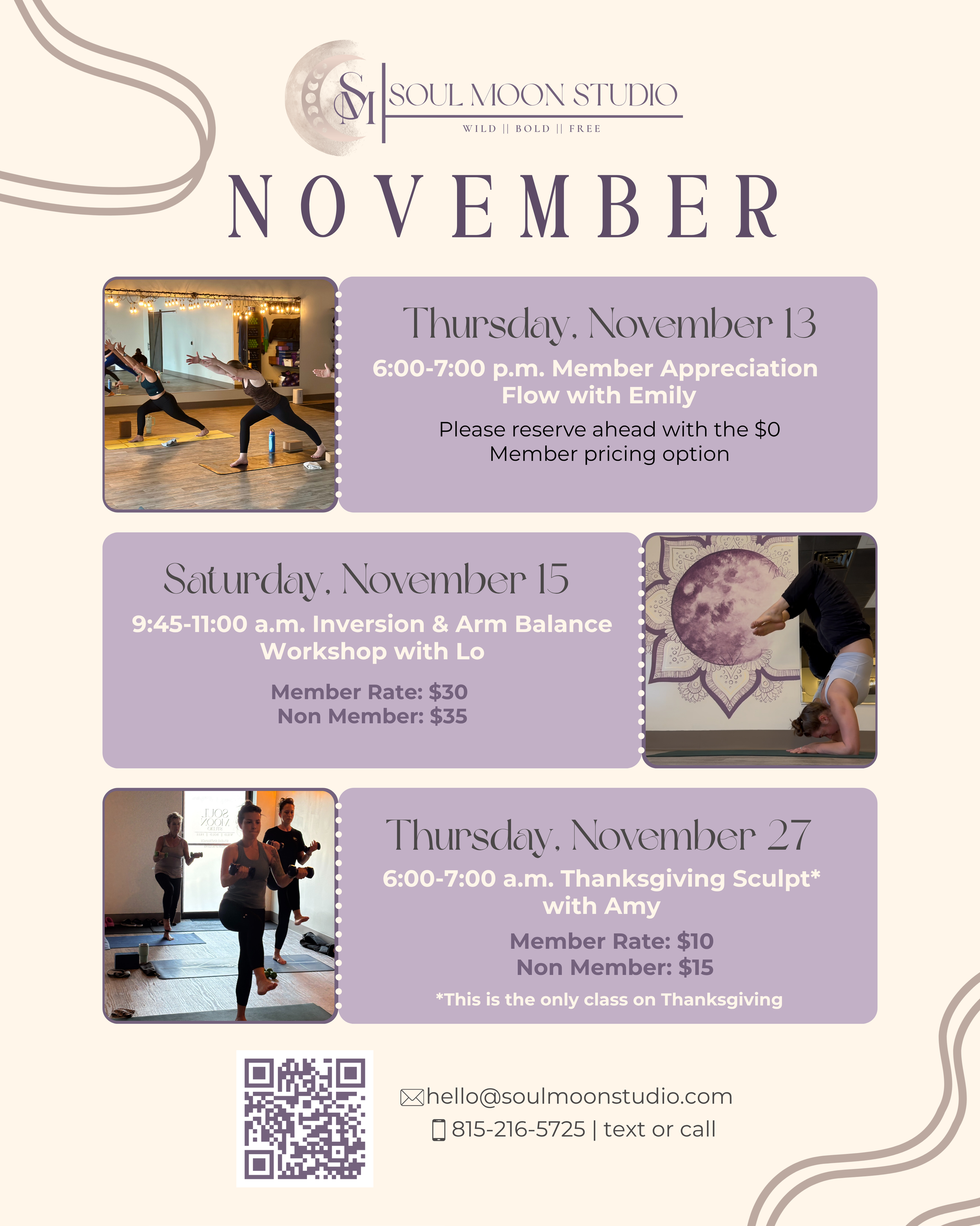 At SOUL MOON STUDIO, every class is an invitation to come as you are and reconnect, mind, body, and soul.